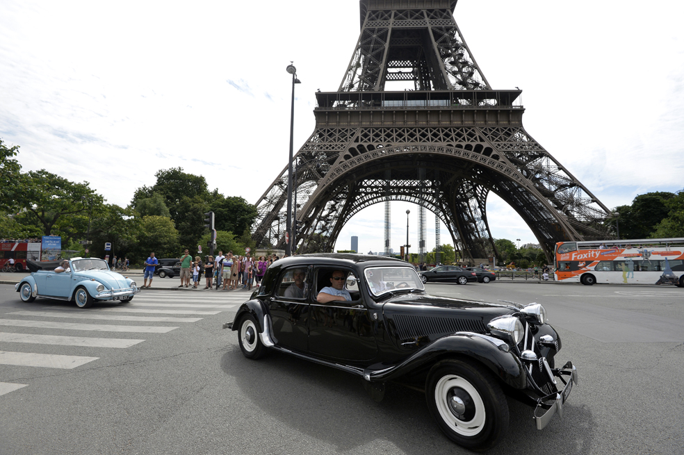 A person drives a Citroen Traction Avant car in front of the Eiffel tower in Paris, on July 28, 2013, during a vintage cars parade as part of the sixth summer edition of the "Traversee de Paris Estivale" ("Summer Paris Crossing"), the largest gathering of classic vehicles in the French capital streets. AFP PHOTO / MIGUEL MEDINA